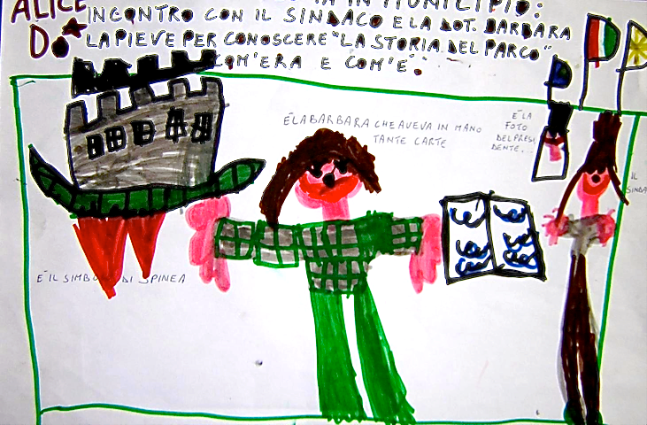 L'immagine che accompagna l'articolo è di Alice: il disegno dell'incontro di una classe (bambini/e di 5 anni) della Scuola d'infanzia "Collodi" di Spinea (VE) con il sindaco e l'archivista del Comune per conoscere la storia del parco (insegnanti C. Scanferla e A. De Pieri, anno scolastico 2005-2006).